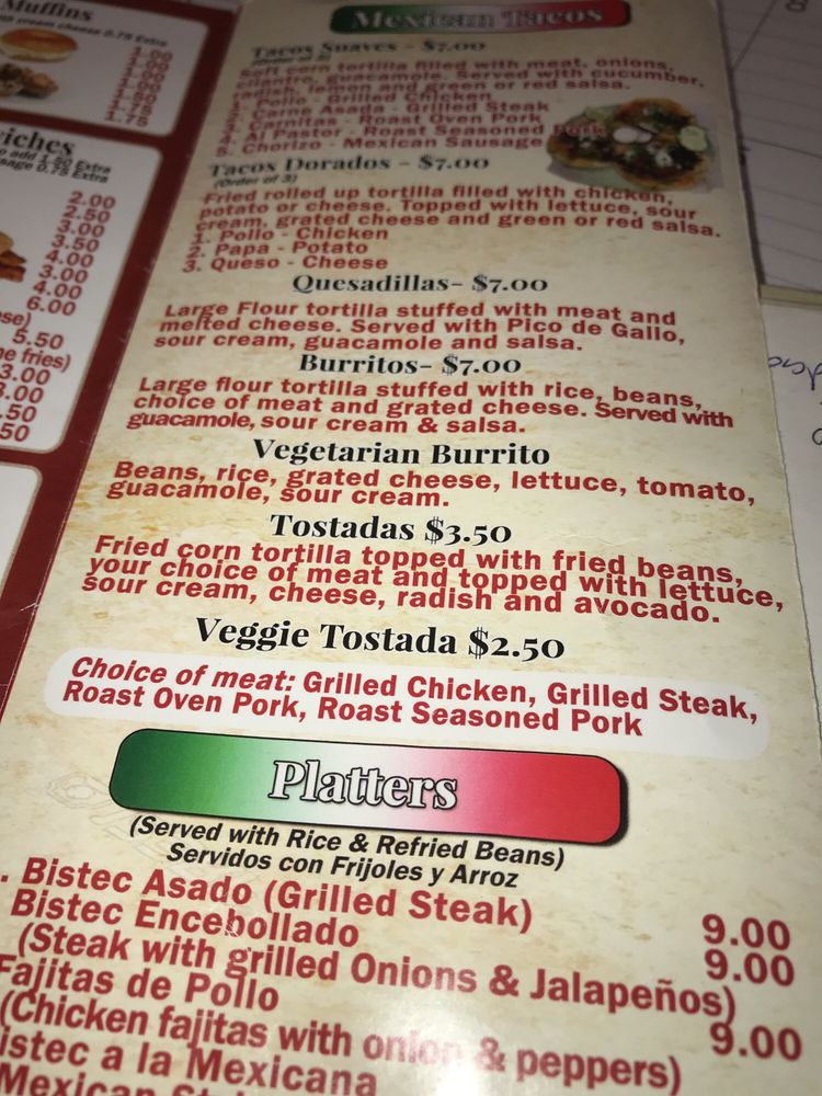 Flat Fried Tortilla Topped with Chorizo (Mexican Sausage), Refried Beans, Lettuce, Tomato, Cheese, & Sour Cream. Mexican Salsa served on the side.